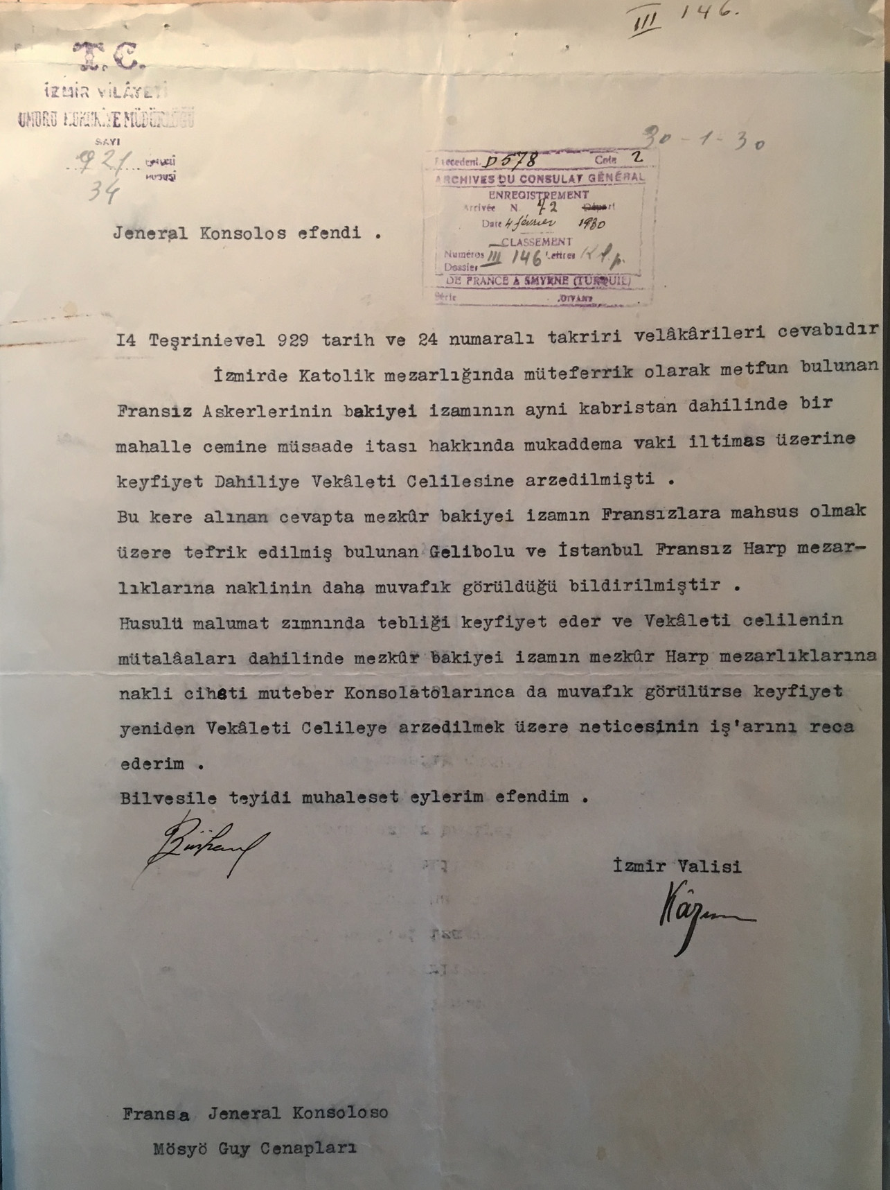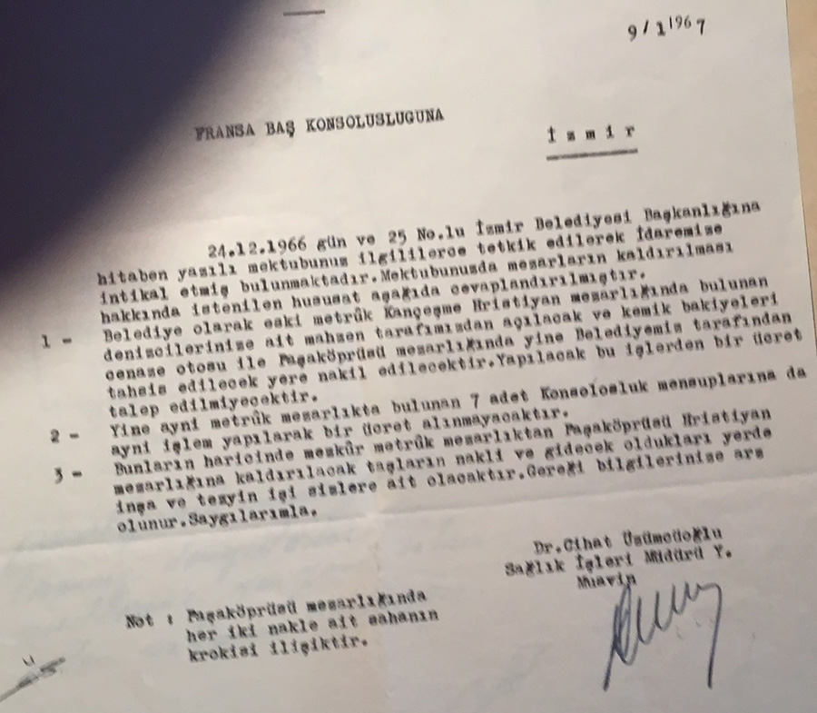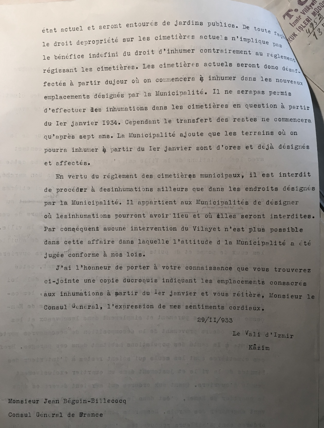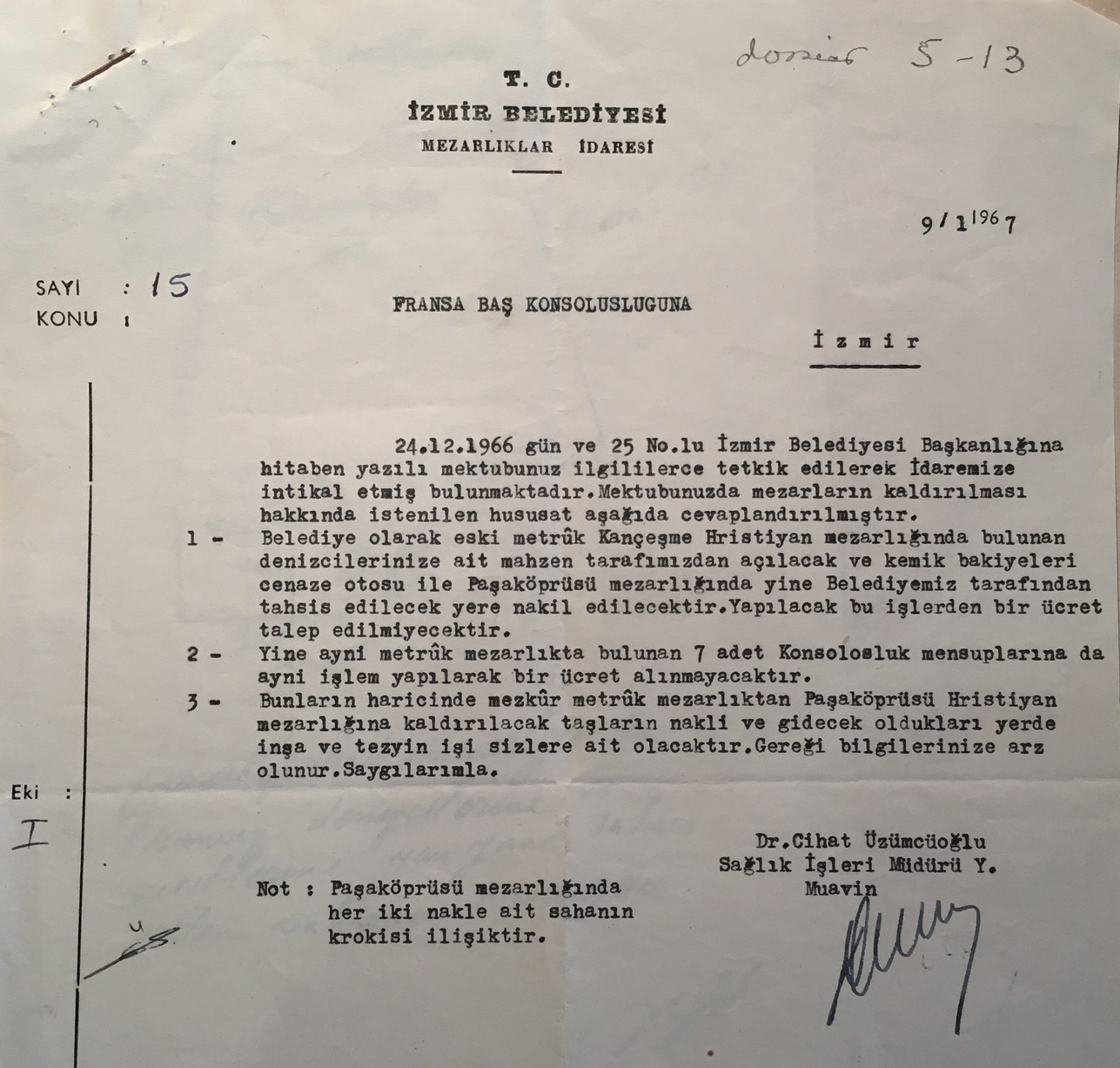 Correspondence between the mayor of Izmir and the French Consulate in 1933 on the decision to halt burials in the Catholic cemetery of Kemer in Izmir (the French Consulate seems to be the only foreign legation acting for this multi-national burial ground) for pubic sanitation purposes.