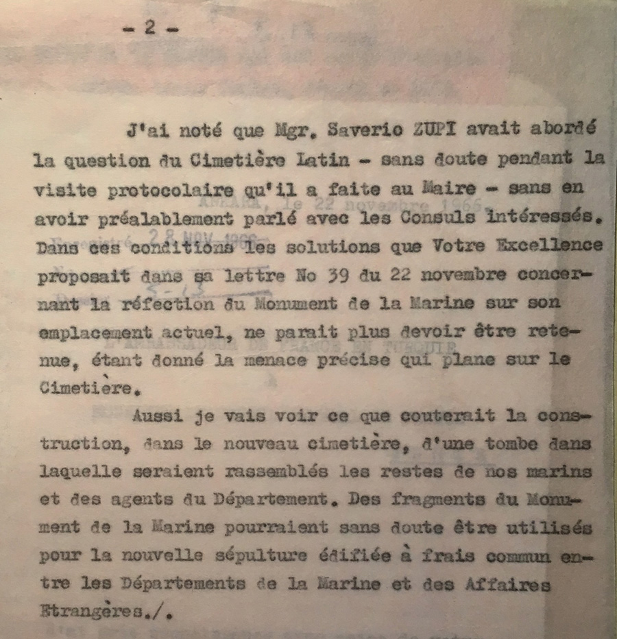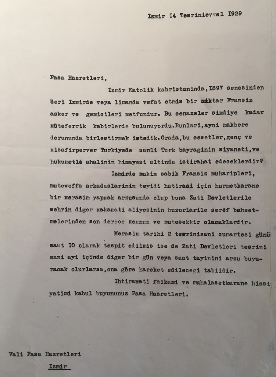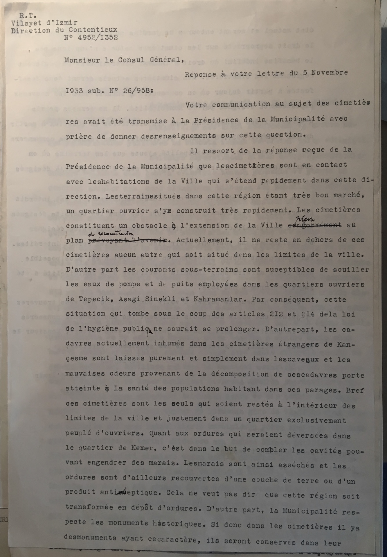Correspondence between the mayor of Izmir and the French Consulate in 1933 on the decision to halt burials in the Catholic cemetery of Kemer in Izmir (the French Consulate seems to be the only foreign legation acting for this multi-national burial ground) for pubic sanitation purposes.