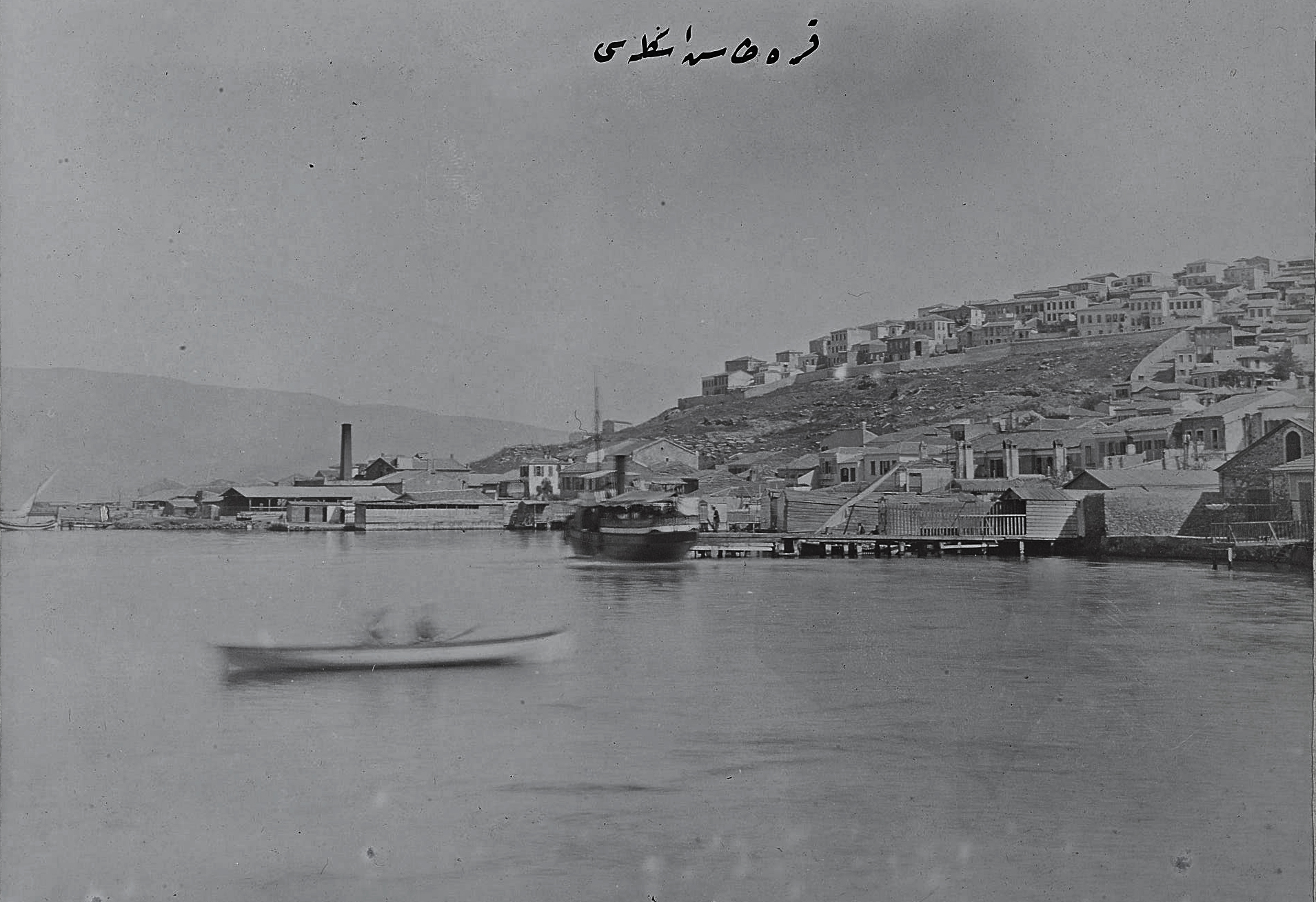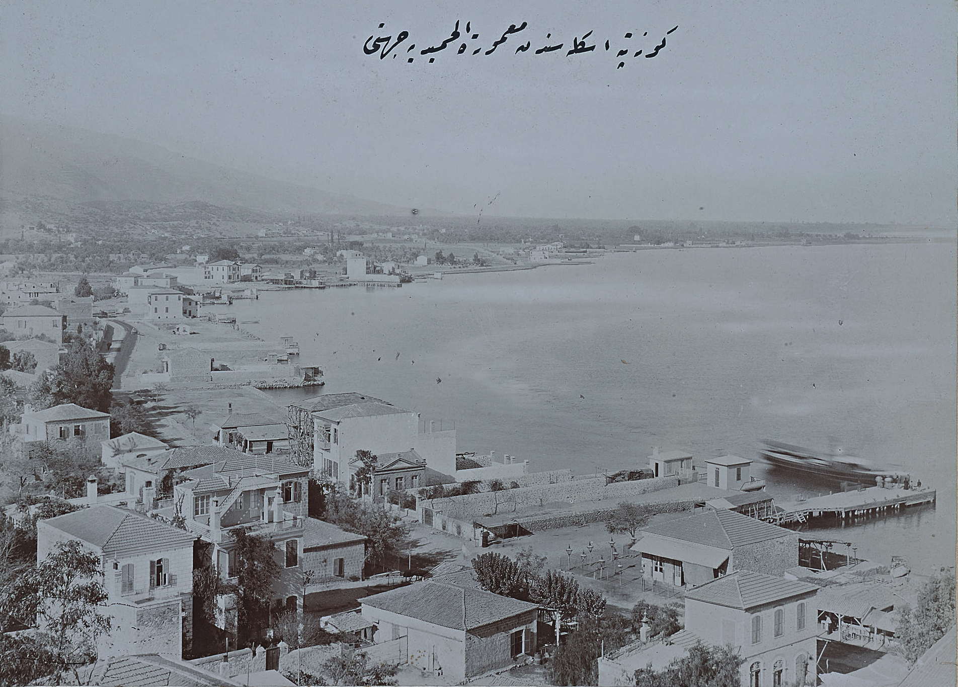 Ferry on the pier at Karataş with the old Jewish cemetery (Bahribaba / Maşatlık) on the hillside beyond The cemetery no longer exists. The postcard below possibly from a slightly earlier time (1870s?) showing the same bay from the landside. The chimney belongs to a acorn processing factory. The photo below that is possibly from the 1890s as seen by the increase in housing all along.