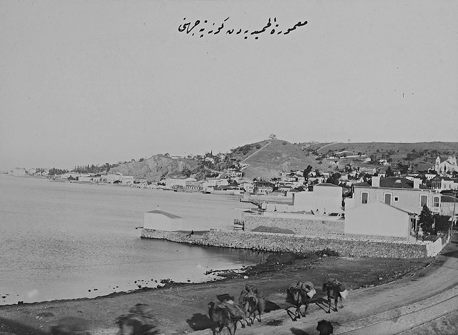 Series of photos from the Sultan Abdulhamit IIs commissioned photo albums across the Ottoman Empire, here showcasing examples of Smyrna and region. This appears to show the outlying region to the south-west of the city, perhaps equating to the zone around Üçkuyular (Uçracti) beyond Güzelyalı (Kokaryalı), about 10 km soutwest of the centre of the town. The wider monumental collection portrays the Ottoman Empire during the reign of one of its last sultans, Abdul-Hamid II. The 1,819 photographs in 51 large-format albums date from about 1880 to 1893. They highlight the modernization of numerous aspects of the Ottoman Empire, featuring images of educational facilities and students; well-equipped army and navy personnel and facilities; technologically advanced lifesaving and fire fighting brigades; factories; mines; harbors; hospitals; and government buildings. Most of the places depicted are within the boundaries of modern-day Turkey, but buildings and sites in Iraq, Lebanon, Greece and other countries are also included.