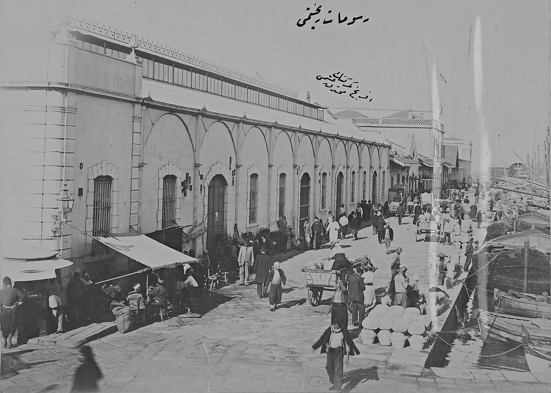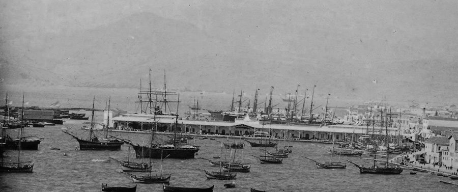 According to editor M. Yavuz Corapcioglu the Rubellin Father and Son were of French origin and operated the Photographie Parisienne studio in Smyrna in the 1870s and 1880s. They seem to have photographed extensively throughout the Middle East, especially the region of Turkey. The photo is dated around 1876-78. The nine warehouses that are shown situated tangentially to the Customs’ Pier (the actual Customs have not been constructed yet) belonged to the Société des Quais de Smyrne, the company that built the quay, operated the harbour and leased them to merchants such as the Aliotti Bros.
