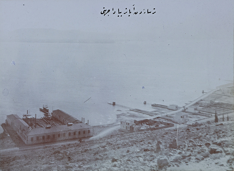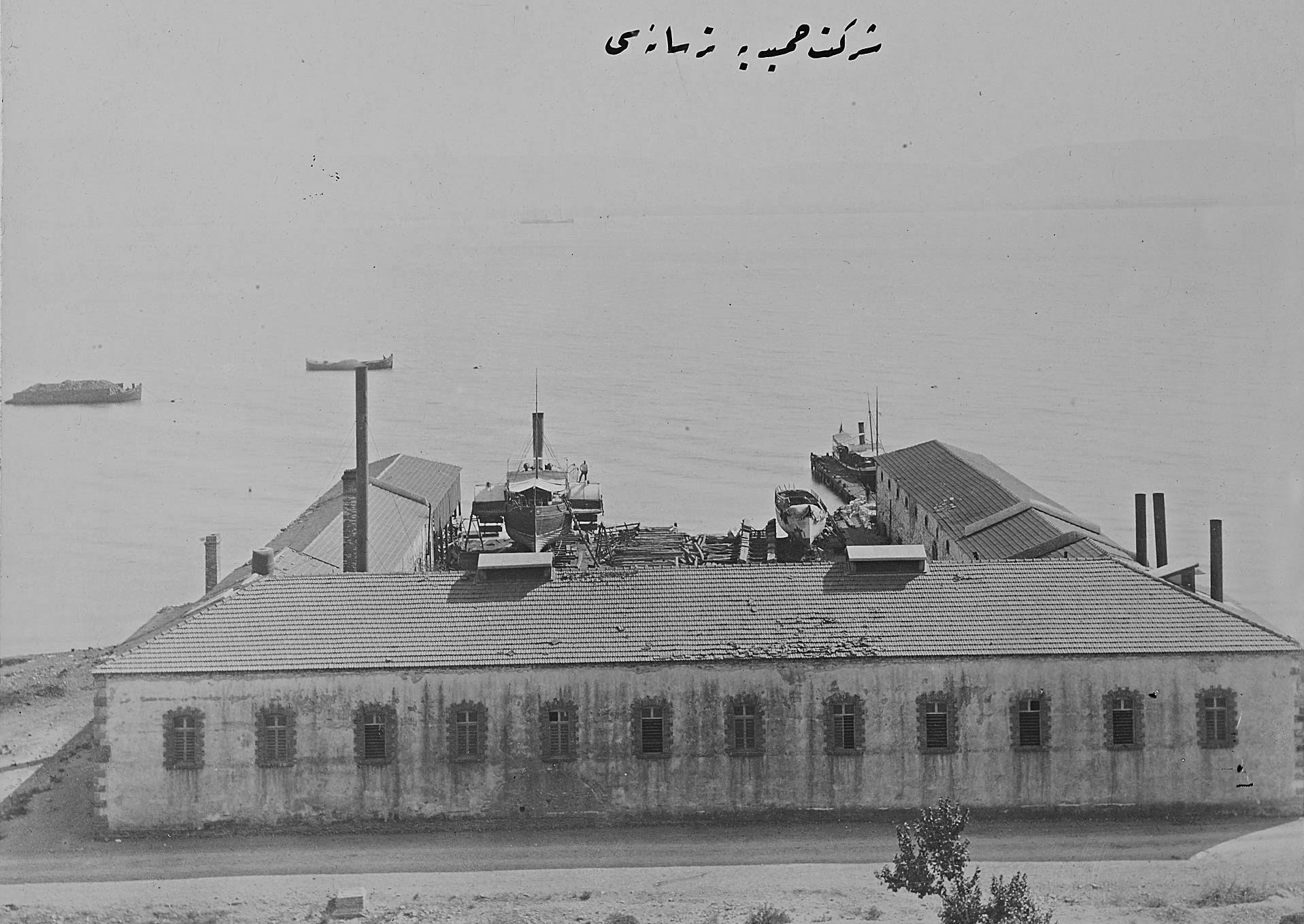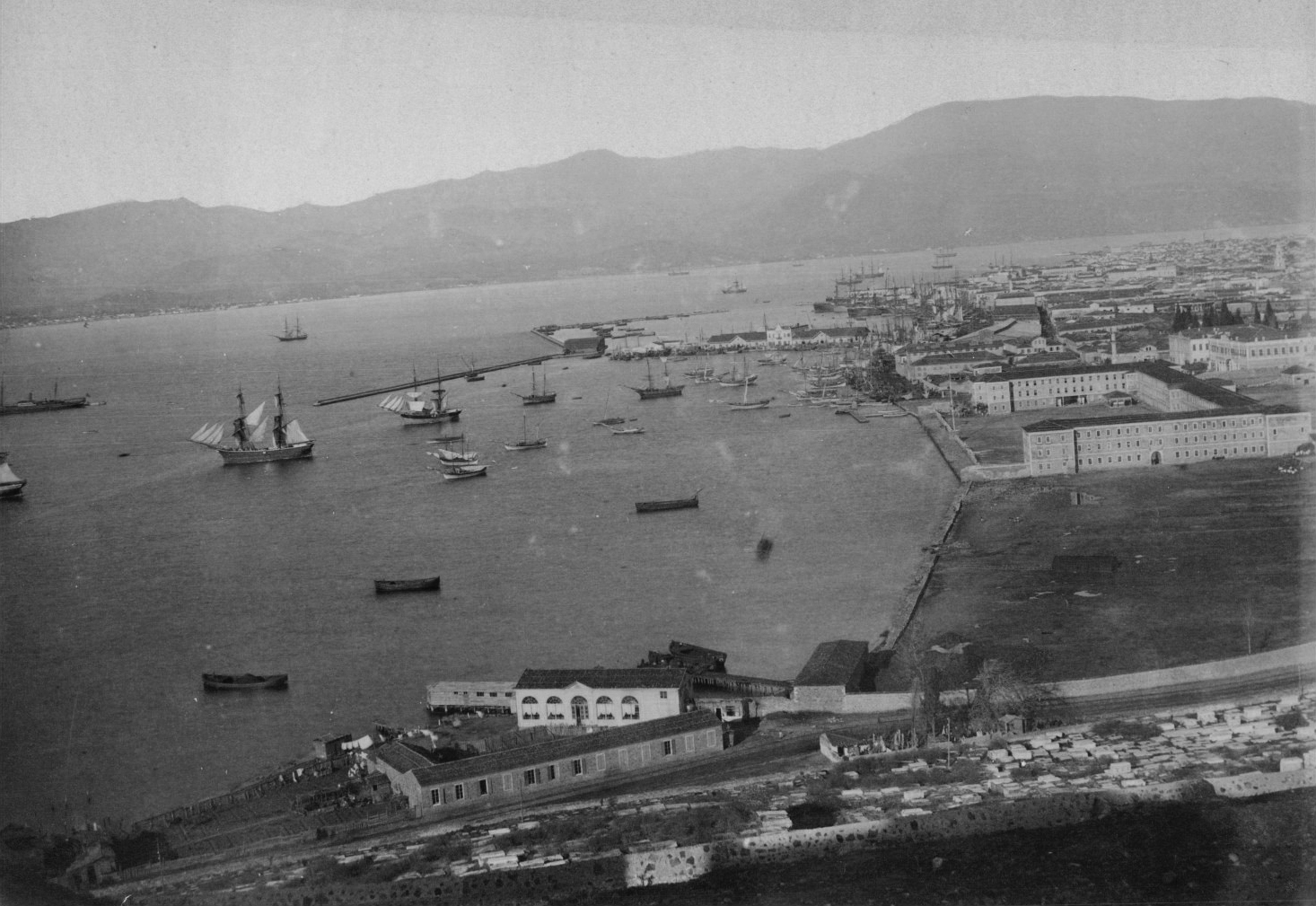 The inner section of the bay of Smyrna with the settlement of Bayraklı in the distance and an acorn processing factory in the foreground in the area of Turan (Agia Triada) with what appears to be a boat repair yard within the compound.