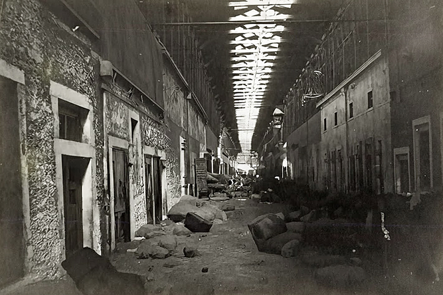 Looking from the opposite direction at the former custom warehouse with the ‘Smyrna Fig Packers’ company warehouse on the right, as seen with the lettering. The building to the left is the Central Fishmarket.