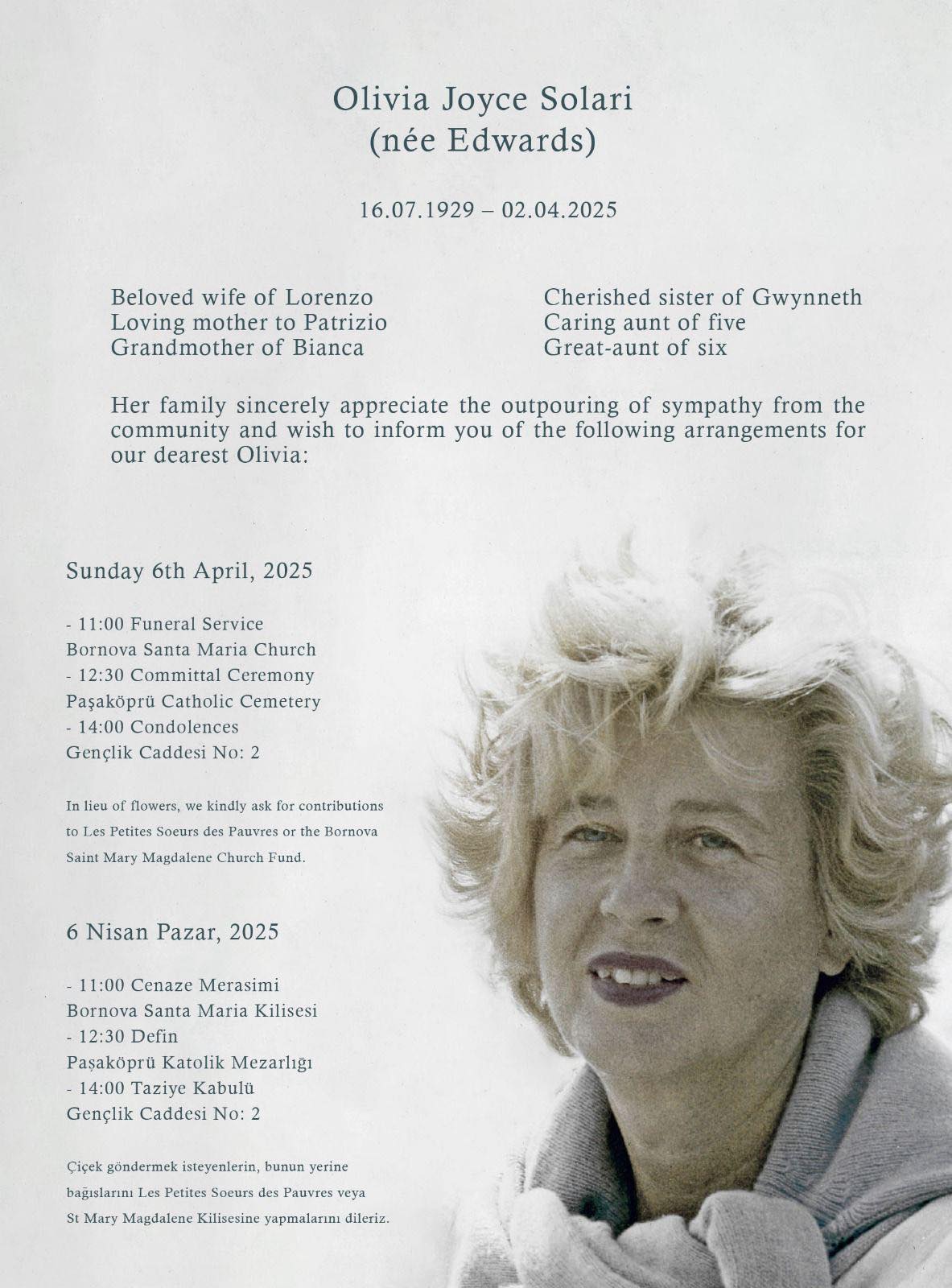 My name is Olivia Joyce Solari nee Edwards, born 1929 in Izmir. I married Lorenzo Solari of Izmir in 1954 and I have one son, Patrizio Solari who lives in the USA who worked (since retired) for MacAndrews and Forbes (first in Iskenderun, then in America) the licorice company that was established in Izmir in Ottoman times, but is now fully American.