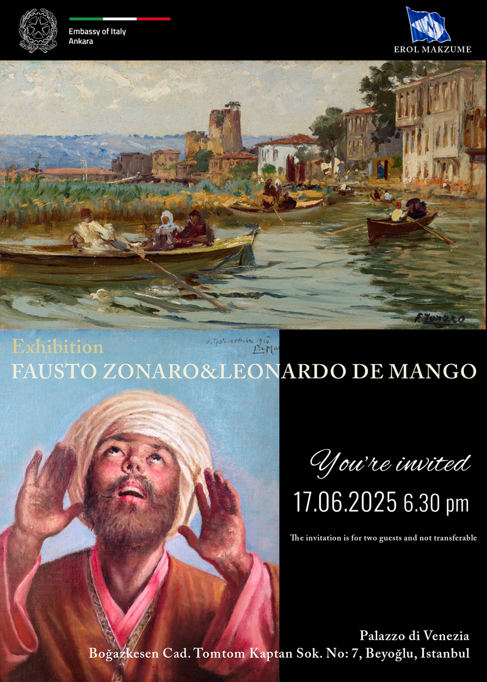 Exhibition & presentation: Fausto Zonaro & Leonardo De Mango - Erol Makzume, 17 June 2025 - Palazzo di Venezia, Istanbul - poster: