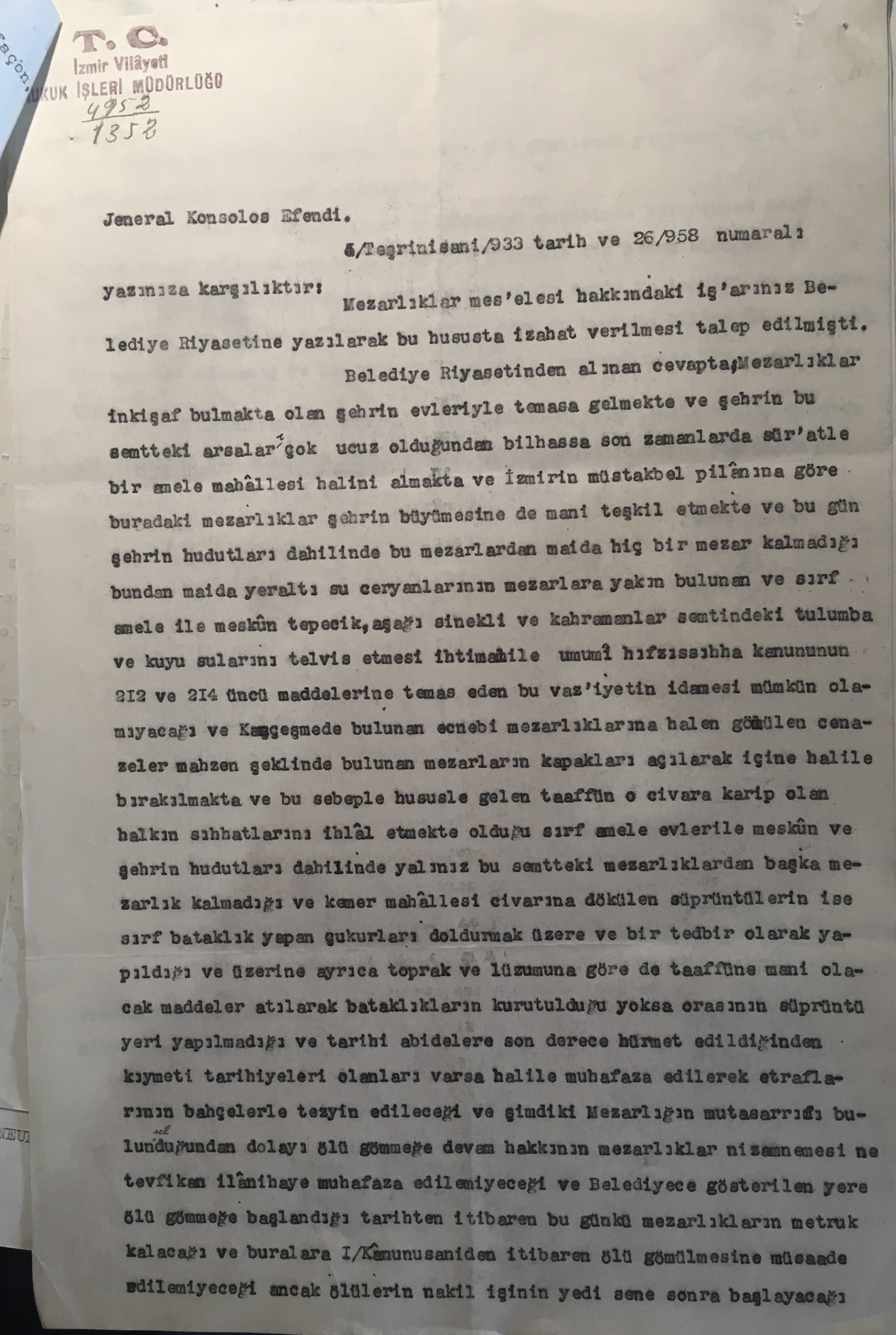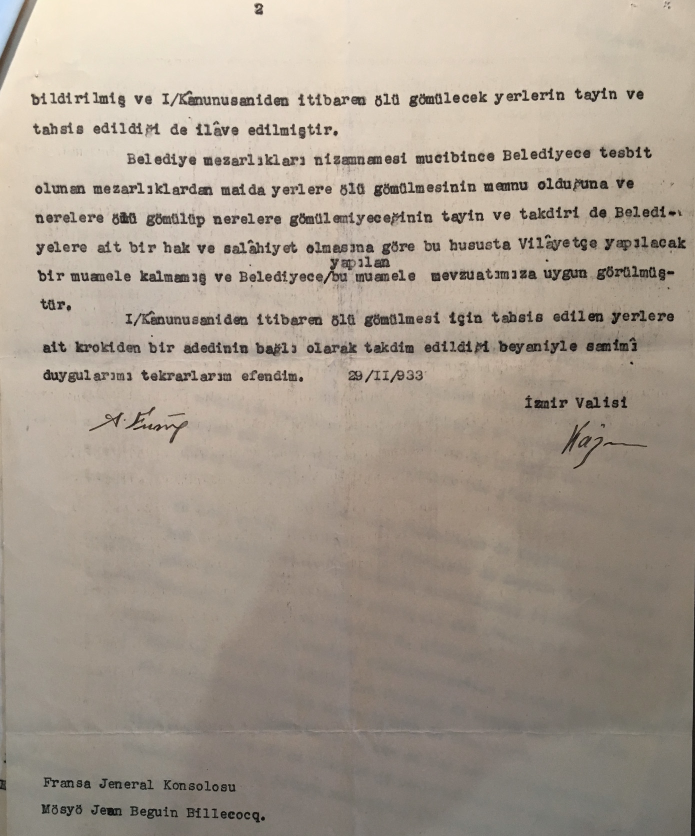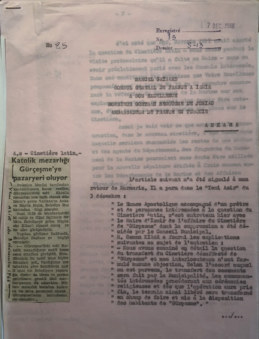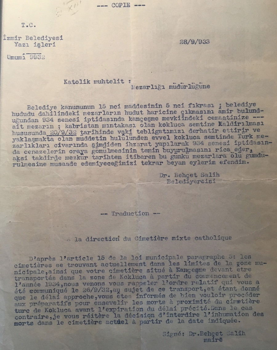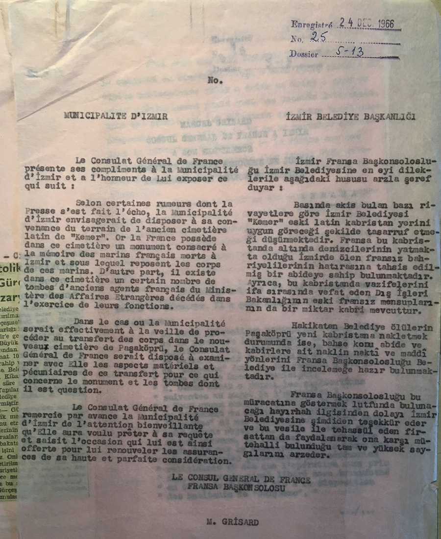 Correspondence between the mayor of Izmir and the French Consulate in 1933 on the decision to halt burials in the Catholic cemetery of Kemer in Izmir (the French Consulate seems to be the only foreign legation acting for this multi-national burial ground) for pubic sanitation purposes.