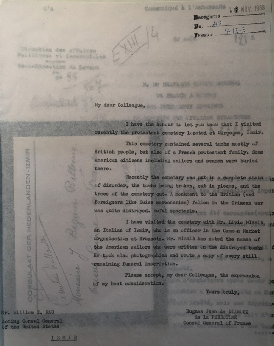 Letter from 1964 sent from the French Consular General in Izmir Hagues Jean de Dianoux to the acting Consul General of the United States William E. Rau describing in detail the recent vandal destruction of the Protestant (Anglican) cemetery in Kemer. It is not clear if a similar communication was also sent to the British Consul General at the time (Richard Edward Wilkinson in office 1957-1965)?