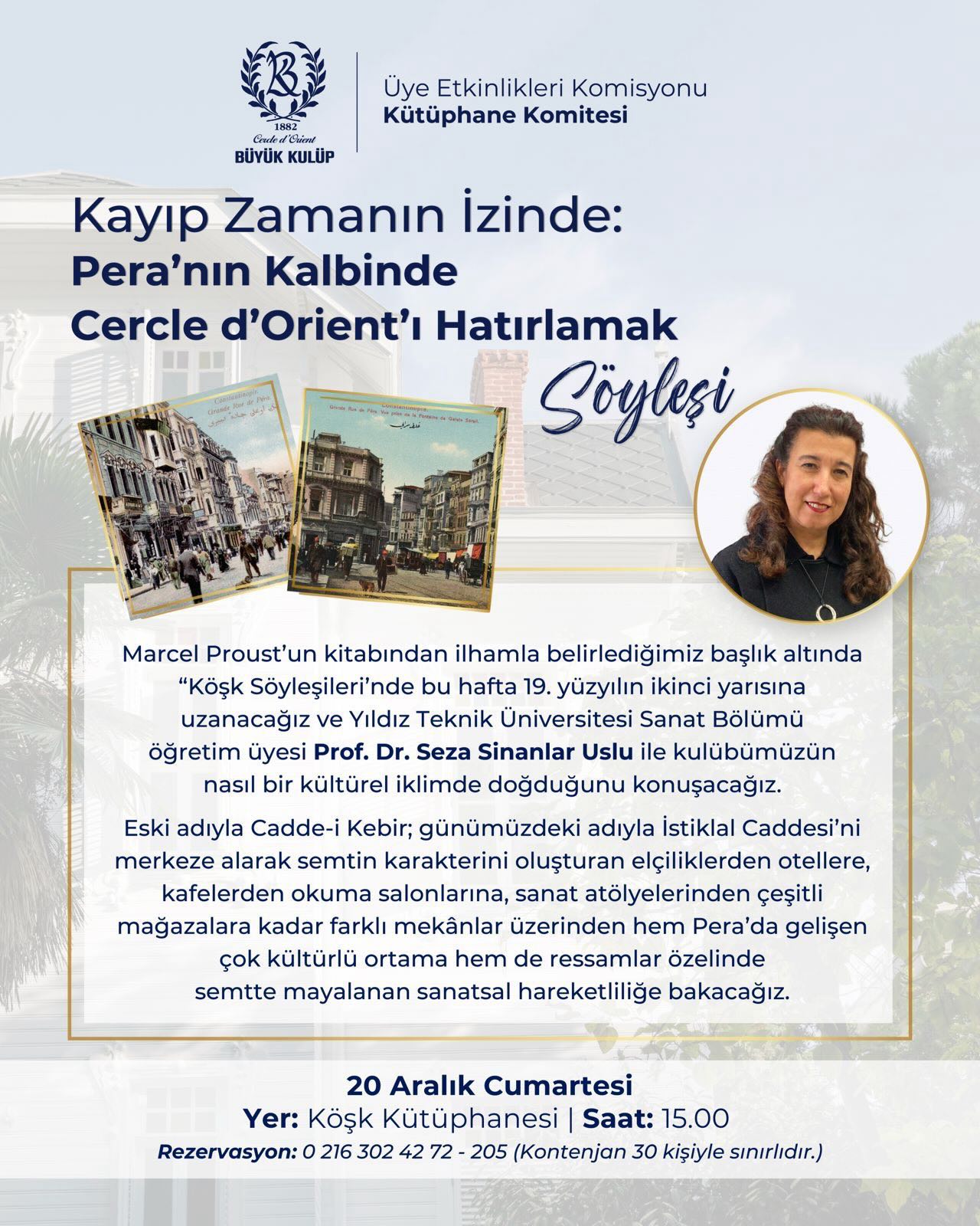 Söyleşi: ‘Kayıp zamanın izinde: Pera’nın kalbinde Cercle D’Orient’ı hatırlamak’, Seza Sinanlar Uslu, 20 December 2025 - Kösk Kütüphanesi, Büyük Kulüp, Kadıköy, Istanbul - poster: