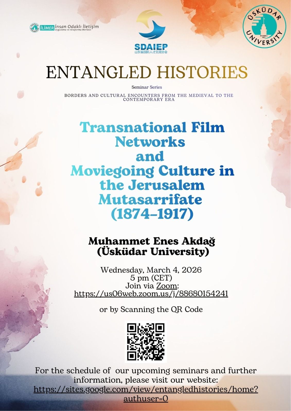 Online presentation: ‘Transnational Film Networks and Moviegoing Culture in the Jerusalem Mutasarrifate (1874–1917)’, Muhammet Enes Akdağ, 4 March 2026 - 12th session of "Entangled Histories: Borders and Cultural Encounters from the Medieval to the Contemporary Era" - poster: