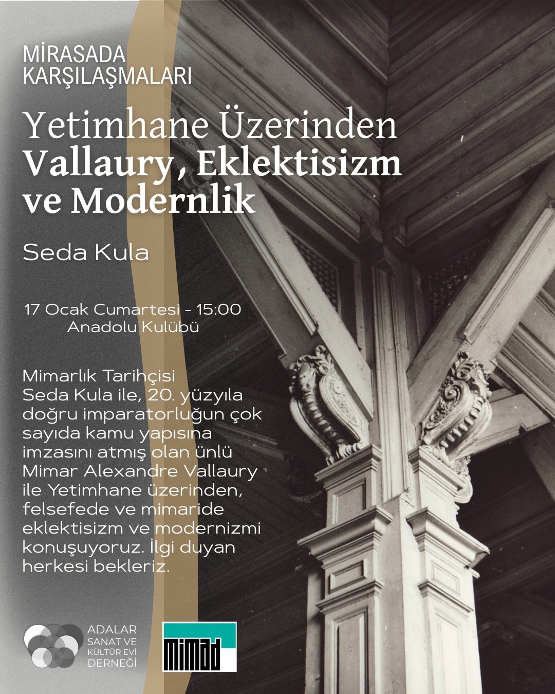 Mirasda Karşılaşmaları: ‘Yetimhane Üzerinden Vallaury, Eklektisizm ve Modernlik’, Seda Kula, 17 January 2026 – Anadolu Kulübü, Büyükada, Istanbul - poster:
