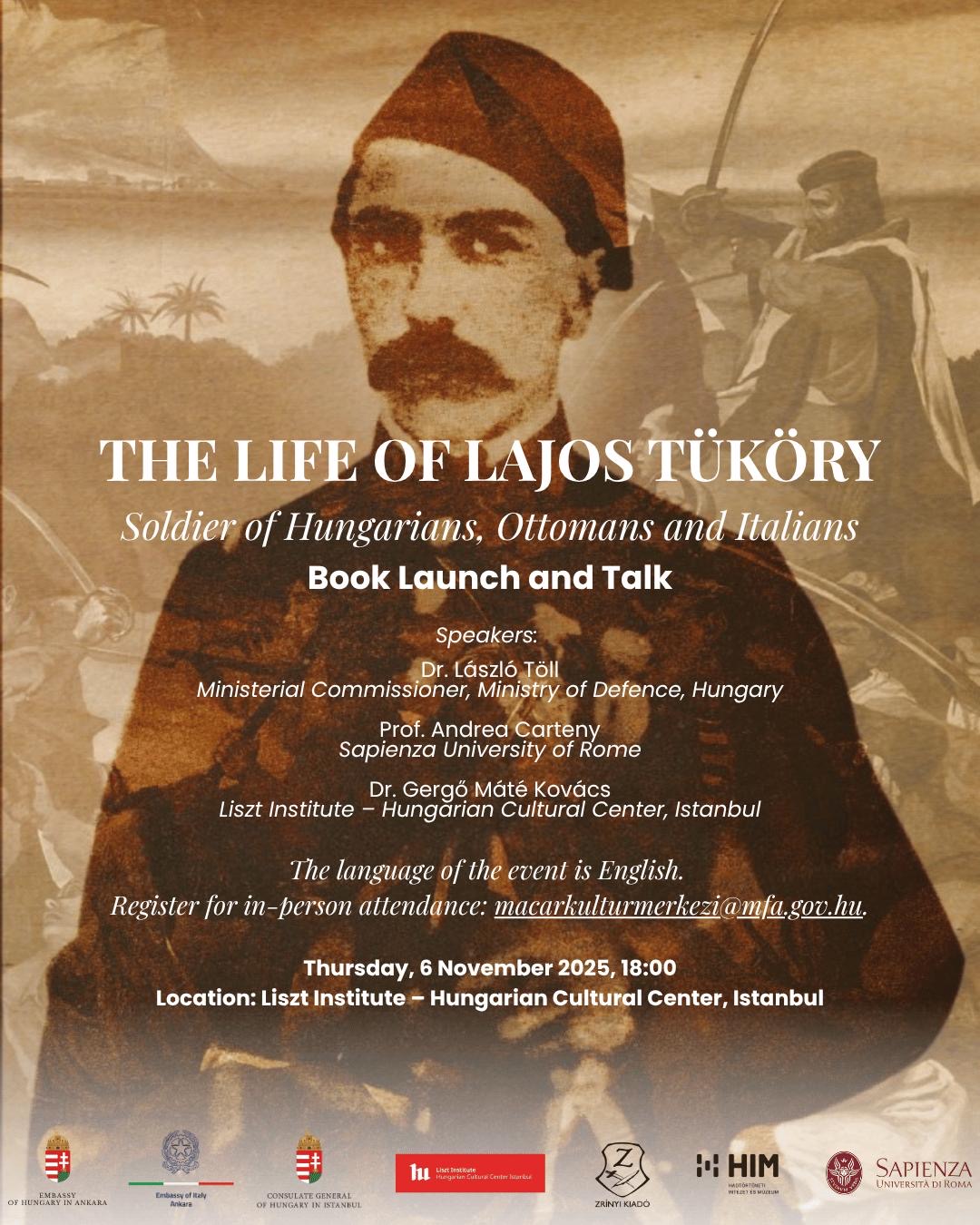 In-person book launch and talk: The Life of Lajos Tüköry: Soldier of Hungarian, Ottomans and Italians, Dr. László Töll, Prof Andrea Carteny, Dr. Gergő Máté Kovács, 6 November 2025 – Liszt Institute, Hungarian Cultural Centre, Istanbul - flyer: