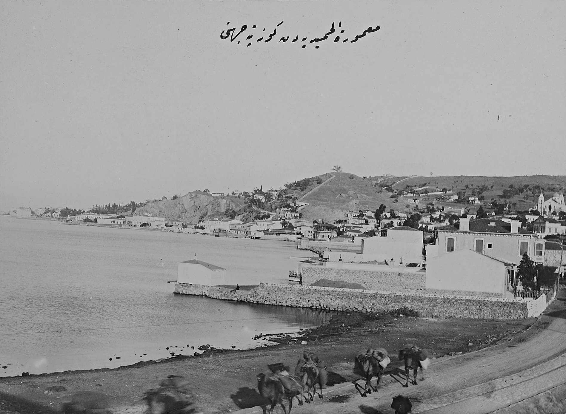 The neighbourhood of Güzelyalı looking north-east towards Göztepe (Enopi) hill and the city beyond with a caravan train in the foreground and a Greek Orthodox Agios Pantelemion church in the background, that no longer stands.