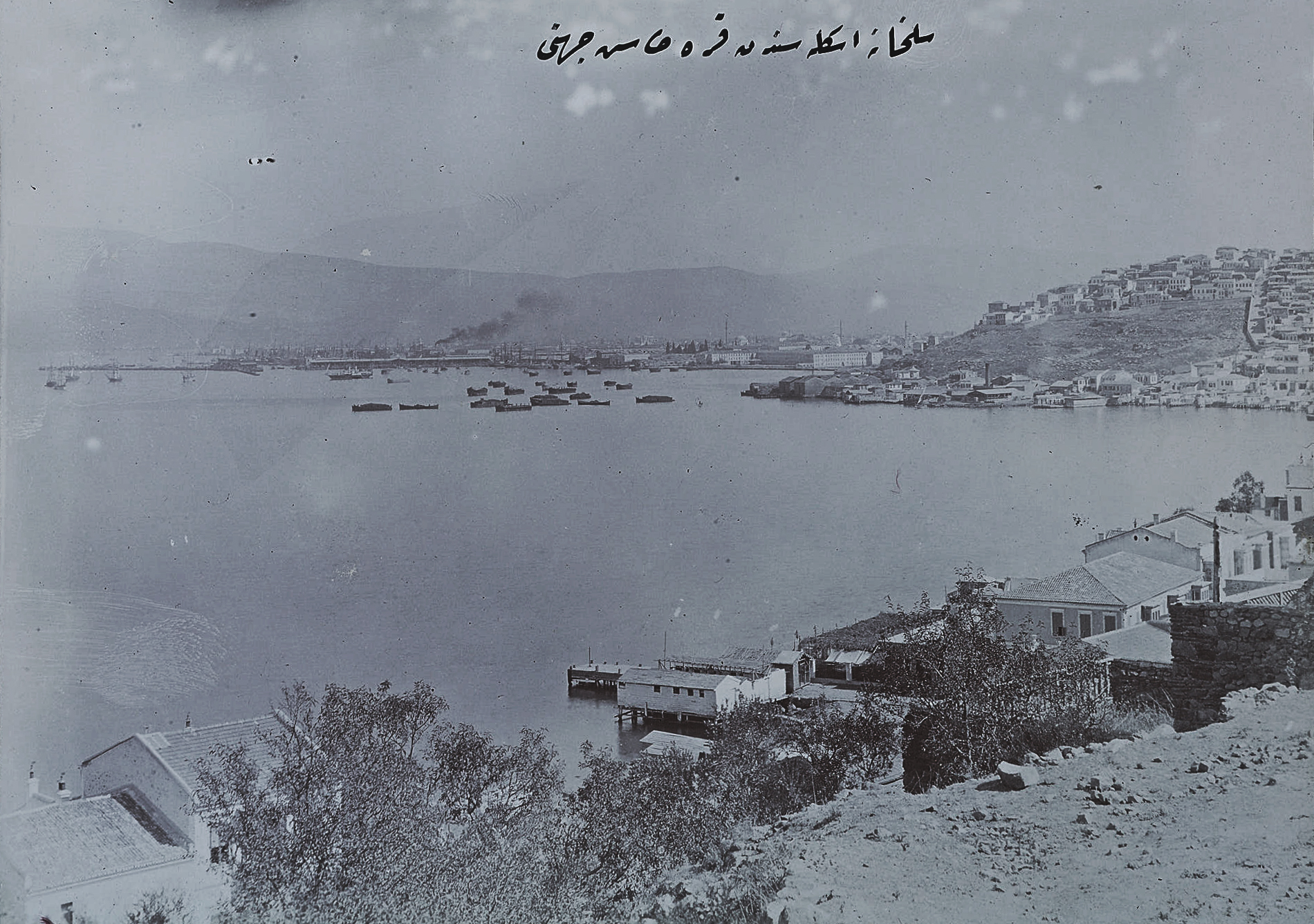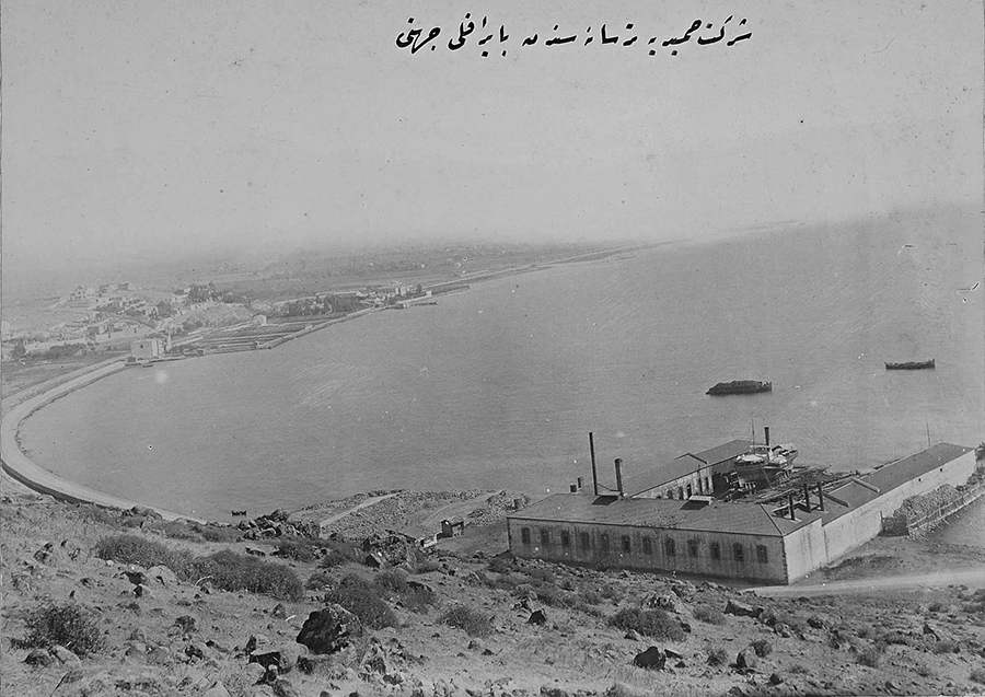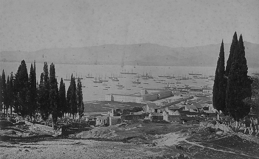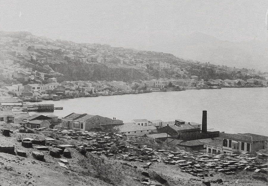 The inner section of the bay of Smyrna with the settlement of Bayraklı in the distance and an acorn processing factory in the foreground in the area of Turan (Agia Triada) with what appears to be a boat repair yard within the compound.