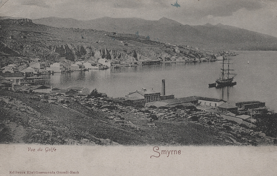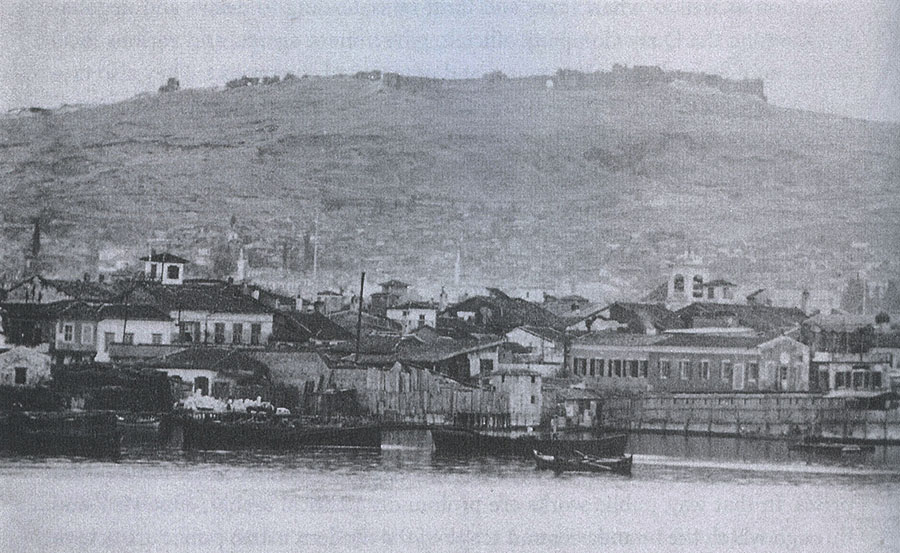 Karataş (Kallithea) neighbourhood shoreline with the city of Smyrna and bay in the background. In former times Karataş had a significant Jewish population.