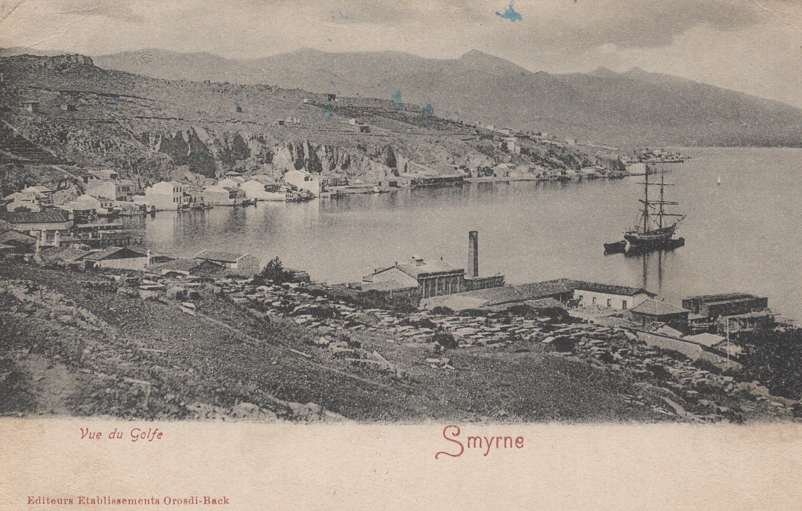 Ferry on the pier at Karataş with the old Jewish cemetery (Bahribaba / Maşatlık) on the hillside beyond The cemetery no longer exists. The postcard below possibly from a slightly earlier time (1870s?) showing the same bay from the landside. The chimney belongs to a acorn processing factory. The photo below that is possibly from the 1890s as seen by the increase in housing all along.