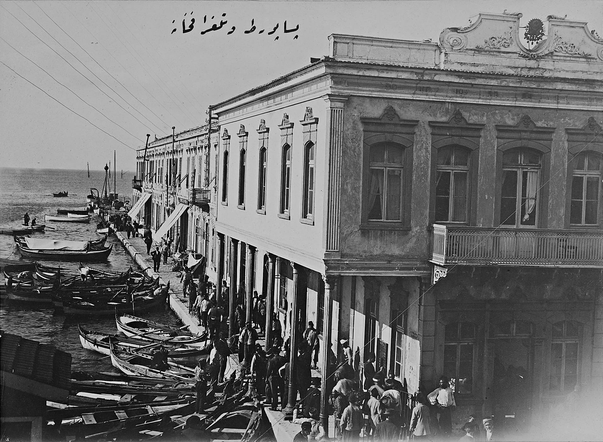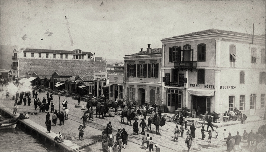 Grand Hotel d’Egypte operated on this spot between 1881 and 1887, so this is a probable date span of the photo. By 1922 the building hosted Grand Hotel Paradisos and although it was affected by the Great Fire, it still survives, though in a very poor state.