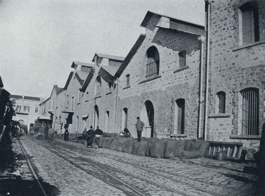 These warehouses were at Beyler Sokak (Milli Kütüphane Cd.). In the distance, the side of the Konak building can be seen and in the foreground the tramway tracks of the Göztepe line.