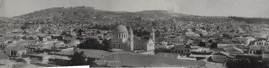 Photos-stich of the above 3 photos, looking towards the Turkish districts of Smyrna. Apparently the camera was on the Hagia Fotini belfry. The building in the middle is the Orthodox church of Hagios Georgios Exokastritis. In front of it is the roof of Evangeliki Scholi (Evangelical School) and its associated Museum building. Below perhaps the earliest photo taken of central Smyrna by Rubellin taken around 1860. Bell ringing was allowed for Christians in the Ottoman Empire after the 1856 Imperial Reform Edict. The construction of bell towers gradually followed after so the tower visible there is not from a church but likely the watch-tower for the former British or Austrian consulate in the area.