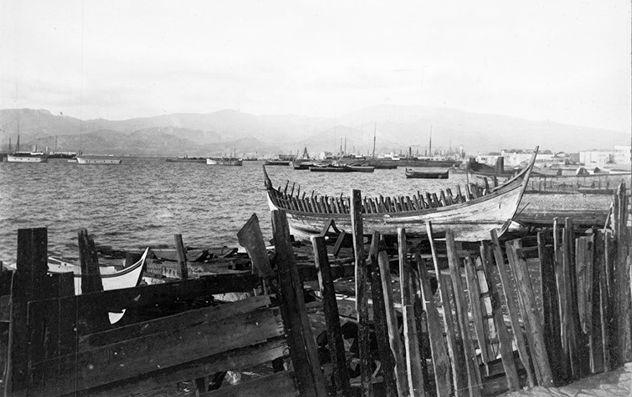 According to editor M. Yavuz Corapcioglu the Rubellin Father and Son were of French origin and operated the Photographie Parisienne studio in Smyrna in the 1870s and 1880s. They seem to have photographed extensively throughout the Middle East, especially the region of Turkey. The photo is dated around 1876-78. The nine warehouses that are shown situated tangentially to the Customs’ Pier (the actual Customs have not been constructed yet) belonged to the Société des Quais de Smyrne, the company that built the quay, operated the harbour and leased them to merchants such as the Aliotti Bros.