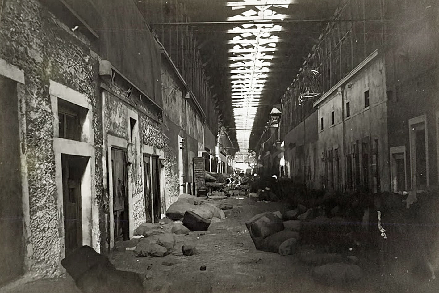 Interior view of these warehouses giving a rather chaotic impression, so perhaps at the end of their working life?