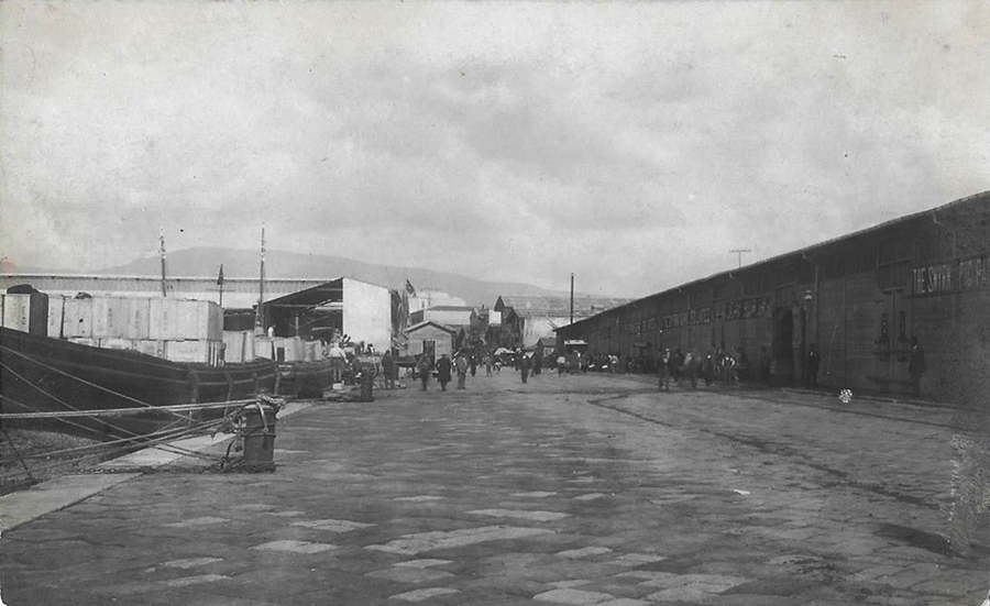 Looking from the opposite direction at the former custom warehouse with the ‘Smyrna Fig Packers’ company warehouse on the right, as seen with the lettering. The building to the left is the Central Fishmarket.
