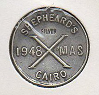 Not a trade but a promotional ‘keep sake’ token in silver presumably for the party guests of Christmas 1944. The hotel was originally established in 1841 by Samuel Shepheard under the name ‘Hotel des Anglais’, and was later renamed ‘Shepheard’s Hotel’. Shepheard’s Hotel was the leading hotel in Cairo and one of the most celebrated hotels in the world from the middle of the 19th century until its destruction in 1952 during the Cairo Fire. Five years after the original hotel was destroyed, a new one was built nearby and was named the Shepheard Hotel. Below a change of design for this token by 1948.